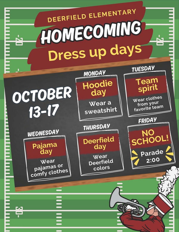 On Thursday, October 23 (rain date Oct. 27) Deerfield High School students will be taking the afternoon to give back to a community that does so much! Students will be participating in activities to help build community relationships and simply say "Thank you" to those that do the most. The freshmen will be delivering care packages, the sophomores will be collecting food for the food pantry, the juniors will be raking leaves in yards in the community, and the seniors will be running a Fall Festival at the elementary school! Some requested items for food pantry donation: canned soup, ramen noodles, mac & cheese, Hamburger Helper, Rice-A-Roni, canned spaghetti, mayonnaise, canned tuna, crackers (not Saltines), dish soap, laundry soap.